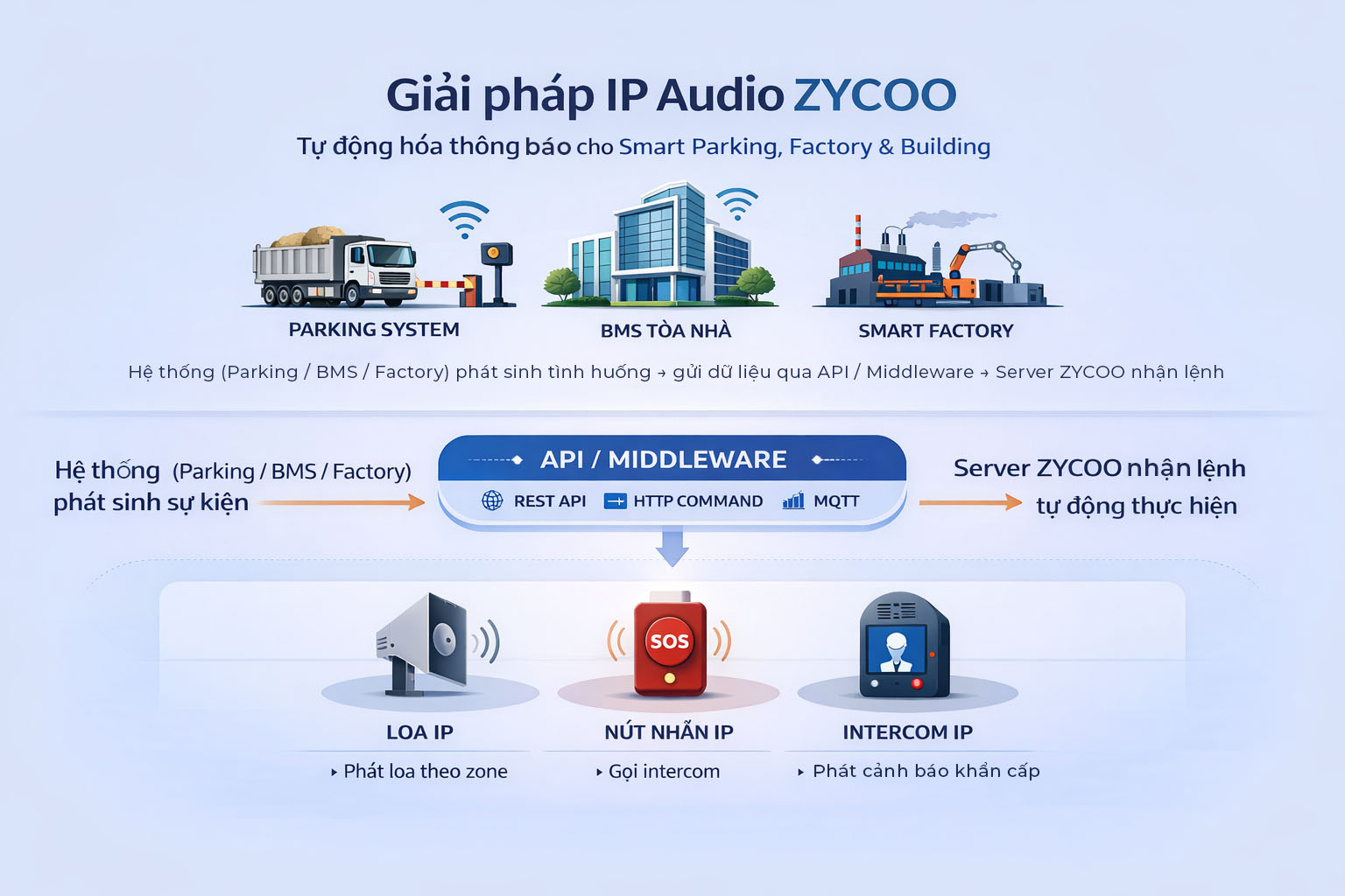 Hệ thống (Parking / BMS / Factory) phát sinh tình huống → gửi dữ liệu qua API / Middleware → Server ZYCOO nhận lệnh → tự động thực hiện các hành động như phát thông báo theo từng khu vực (zone), kích hoạt intercom hoặc phát cảnh báo khẩn cấp.